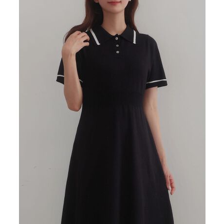 CENEA 薄手配色ラインポロニットワンピース【ペチスカートSET】