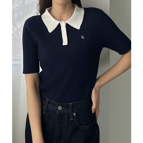 Louere ロゴ刺繍半袖リブニットポロ
