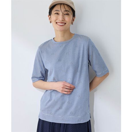 緻密なミジンボーダーにドットのような変化を加えたデザインがユニークな1枚。
