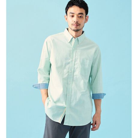 スマートに見えるシルエットにし、前立てのテープ使いや台襟裏、カフス裏のシャンブレー切り替えなどきれい目スタイルにも使用できます。