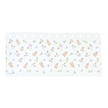 ほわころくらぶの仲間たちのチラシ柄カフェカーテンです。白を基調とした優しい色合いで、インテリアに癒しを添えてくれます♪
