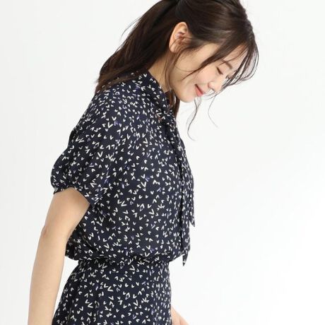 控えめなボウタイが上品な印象のプリントブラウス。