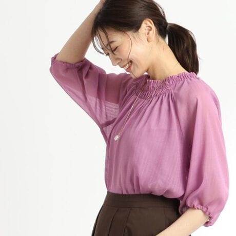 シャーリングデザインの幅にこだわった上品で大人っぽさのあるブラウス。
