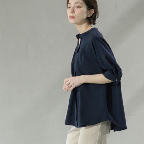 麻調のポリエステル素材が春夏らしい、タックデザインのスキッパーブラウス