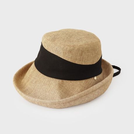 麻調素材に異素材の巻きをデザインした涼やかなデザインのハット。