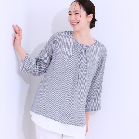 ブラウスとタンクトップをレイヤードしたかのような一枚でサマ見え、時短コーデが可能なトップス。