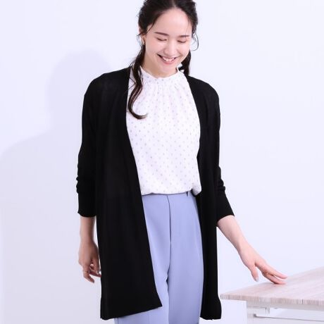 ・素材が涼しいカーディガンで丈がちょうどよく真夏でも活躍できるアイテムだと思う。