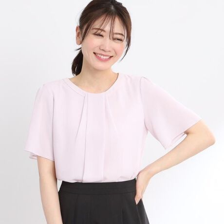 シンプルなタックデザインと生地を重ねたデザインで動きを出した一枚でも決まるブラウス。