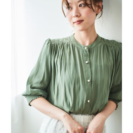 パウダーサテン袖シャーリングブラウス