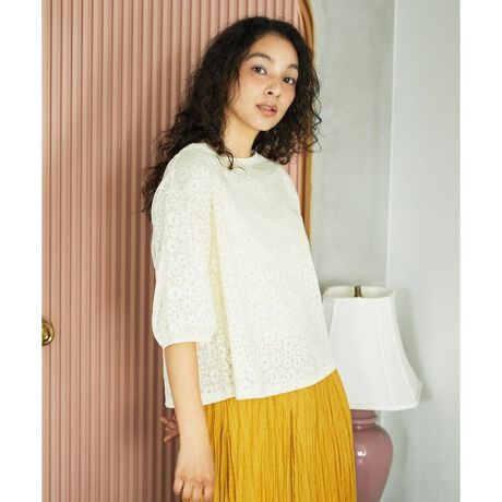 シアー感がある花柄のカットソープルオーバー。全体的にゆったりした着心地の良いシルエットです。ボートネックで首元がすっきりした印象に。袖に丸みをもたせたデザインで、女性らしい着こなしを叶えつつ楽な着用感を実現しました。着合わせしやすいシンプルでコンパクトな丈感も魅力。花柄は単色で編まれているため無地のようにも見え、普段のコーディネート取り入れやすいアイテムです。