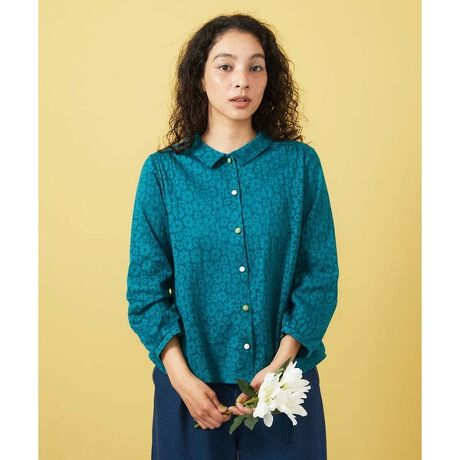 シアー感がある花柄のブラウスライクなカットソー。着合わせしやすいシンプルでコンパクトなボックスシルエットで、腕回りや袖口に余裕を持たせた羽織りとしても使いやすいサイズ感です。襟付きのブラウスライクなデザインによってしっかり見えも叶います。花柄は単色で編まれているため無地のようにも見え、普段のコーディネート取り入れやすいアイテム。配色ボタンにも注目です。