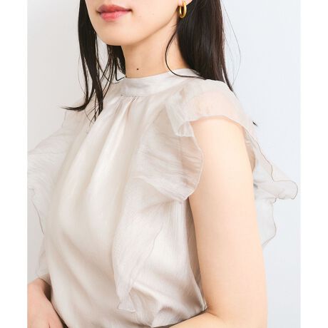 柔らかい風合いと艶のあるシャイニーシアー素材で華やかさを演出します。清涼感があり、レディライクなデザイントップスは夏服として大活躍間違いなし。