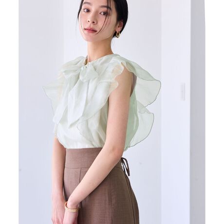 柔らかい風合いと艶のあるシャイニーシアー素材で華やかさを演出します。清涼感があり、レディライクなデザイントップスは夏服として大活躍間違いなし。