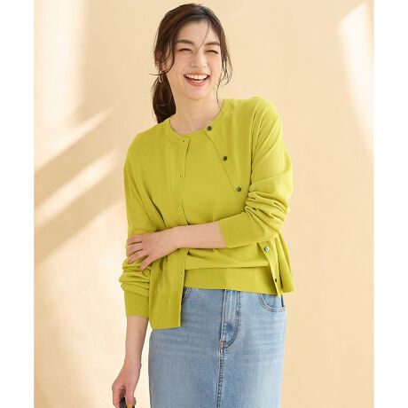 ・ニットカーディガンとノースリーブニットがセットになった、ツインセットアイテム・セットではもちろん別々でも着用できる・カーディガンは配色の釦がポイント(#003オイスター・#060アップルグリーン・#010レッド)・ノースリーブニットは着やすい衿ぐりとフレンチスリーブで、スッキリとしたデザインに