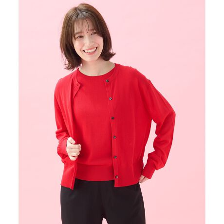 ・ニットカーディガンとノースリーブニットがセットになった、ツインセットアイテム・セットではもちろん別々でも着用できる・カーディガンは配色の釦がポイント(#003オイスター・#060アップルグリーン・#010レッド)・ノースリーブニットは着やすい衿ぐりとフレンチスリーブで、スッキリとしたデザインに