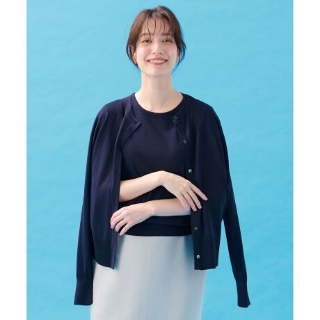 ・ニットカーディガンとノースリーブニットがセットになった、ツインセットアイテム・セットではもちろん別々でも着用できる・カーディガンは配色の釦がポイント(#003オイスター・#060アップルグリーン・#010レッド)・ノースリーブニットは着やすい衿ぐりとフレンチスリーブで、スッキリとしたデザインに