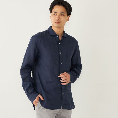 リネン100%で仕立てたセミワイドカラーシャツ。
