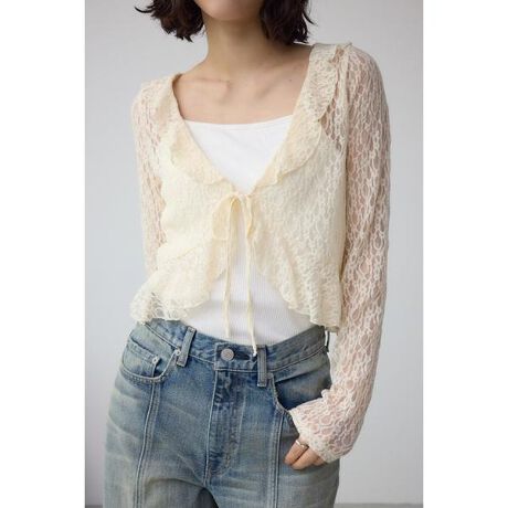 ■レースフリルカーディガン■ポイントトレンドのフリルデザインのレースカーディガンです。伸縮性のあるレース生地を使用しているため、着心地の良い1枚です。■ディティールフロントは身生地と同じレース素材のリボンをつけており、結んで閉めることが可能です。スタイリングの邪魔になりにくいほどよい柄のレースを使用しているため、普段甘めのトップスを着ない方でもチャレンジしやすいです。裾のフリルによって、ウエストが細く見える効果があります。■スタイリングインナーにはキャミソールなどを着用して程よい抜け感を出して着用するのがおすすめです。甘めなスタイリングにはもちろんですが、カジュアルなボトムと合わせるとこなれ感のあるスタイリングが楽しめます。■生地透け感:あり裏 地:なし伸縮性:あり光沢感:なし[注意事項]※画像の商品はサンプルです。実際の商品と仕様、加工が若干異なる場合があります。※画像の商品は光の照射や角度、お使いのモニター環境により、実物と色味が異なる場合がございます。※着用、お取り扱いの際は、アテンションタグをご確認ください。