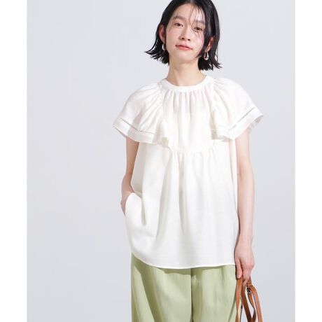 シアー感のある軽やかな素材を使用したブラウス。ノースリーブで涼しげな印象ながら、ヨークに挟み込んだフレアが肩から二の腕をカバーします。部分的にギャザーを寄せた女性らしいディテールや、ヨークまわりはハシゴレースを挟み、シンプルすぎないワンテクあるデザインに。合わせるボトムスによってカジュアルからフェミニンまで様々なスタイリングが叶います。<素材>柔らかく落ち感のある合繊素材を使用しています。<詳細>仕様・後ろボタン裏地・なし透け感・あり / 光沢・なし / 伸縮性・なし生地の厚さ・薄手※モデルの着用画像の場合、光の当たり具合により、実際の色味と異なって見えることがございます。色味は、商品単体の画像をご参照ください。