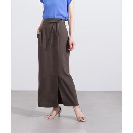 ラップスカートのように見えるデザインと、ナローリボンがポイントのスカート。裾はベンツスリット入りで足元を軽快に。ハイウエストとすっきりめのストレートシルエットで、オンにもオフシーンにも合わせやすく幅広いシーンで着ていただけます。<素材>ドライタッチでメランジ調の生地を使用しています。<詳細>仕様・後ろファスナー裏地・なし透け感・なし / 光沢・なし / 伸縮性・ややあり生地の厚さ・普通※モデルの着用画像の場合、光の当たり具合により、実際の色味と異なって見えることがございます。色味は、商品単体の画像をご参照ください。