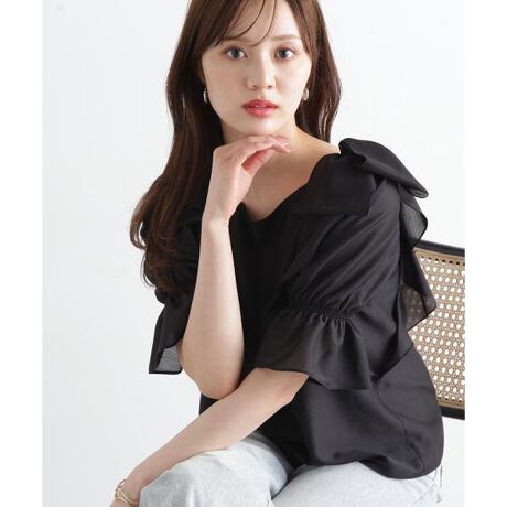 肩にあしらったリボン風ラッフルディテールが愛らしいブラウス。身頃は裏地が付いているので安心して着ていただけます。二の腕をカバーする5分袖もポイント。合わせるボトムによって、キレイめにもカジュアルにも着回しできるデザインです。