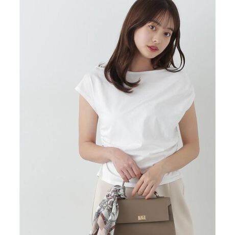 左右の肩まわりでアシンメトリーにタックを取り、デコルテラインのさりげない肌見せで大人ヘルシーに着られるTシャツ。サイドにギャザーを寄せたり、アシンメトリーなデザインで華やかさを演出。カットソーなので着心地が良く、スカートにもパンツにも着回せます。