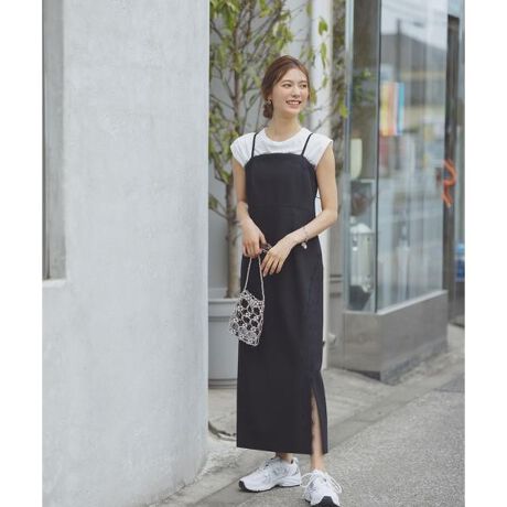 胸元とスリット部分に繊細なレースをあしらったキャミタイプのジャンパースカート。レースからのぞくスリットが愛らしいポイントです。カーディガンやシアーシャツを羽織ったり、コンパクトなTシャツともレイヤードが可能。肩紐はリボンを結ぶと長さ調整ができます。