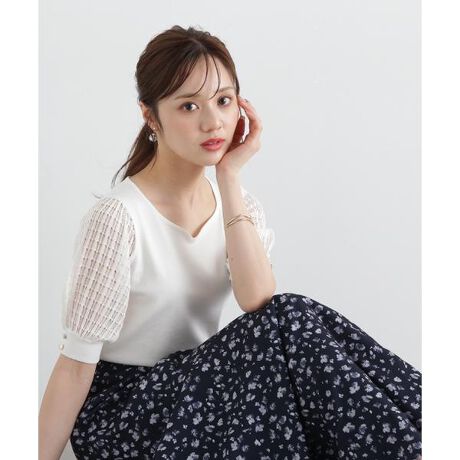 ハートカットの襟ぐりがデコルテをキレイに見せてくれるニットです。身頃はすっきりとした天竺編みにし、袖の透かし編みでほどよい抜け感をプラス。スカートもパンツも合わせやすいデザインなので、ONOFF問わず着ていただけます。