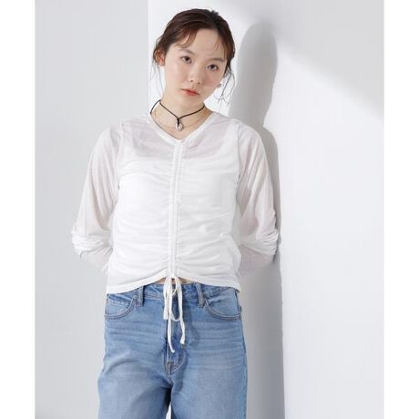 フロントに施されたシャーリングデザインが目を惹くデザイントップス。前後2wayで着回せるデザインで、シャーリングを背中側にして前をシンプルなクルーネックで合わせる着方もオススメです。