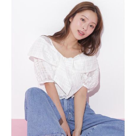 デコルテをキレイに見せながら、ビッグリボンが映えるブラウス。ウエストはゴムシャーリングでフィットします。デニムからスカートまで合わせやすく、カジュアルにもきれいめにも幅広いスタイリングが楽しめる、大人フェミニンな1枚です。※撮影時照明の関係により、色味が違って見える場合がございます。またパソコン・スマートフォンなどの環境により、若干製品と画像のカラーが異なる場合もございます。予めご了承ください。商品の色味は、商品単品画像をご参照下さい。※商品画像はサンプルのため、色味やサイズ等の仕様に変更がある場合がございますので、予めご了承ください。