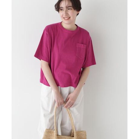 シーズンのポイントカラーを表現したカジュアルな製品染Tシャツです。ニュアンス感を出す為に接ぎ目は表振りミシンで縫製しています。後ろ襟ぐり裏の舟形に挟み込んだグログランテープも製品染めらしく一緒に染めています。