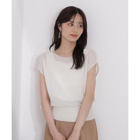 ほんのりキラキラとしたラメ糸を使ったニットです。身頃は少しルーズなシルエット、襟はデコルテがキレイに見えるボートネックデザインです。裾まわりは適度にフィットするのでブラウジングもサマになり、デイリーに着用いただけます。