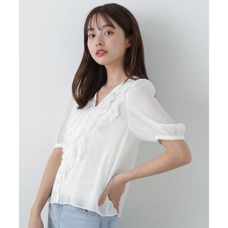 襟と前身頃にフリルをあしらったフェミニンな雰囲気のブラウス。Vネックとフリルを組み合わせ、シャープでありながら甘さを抑えたデザインです。きれいめパンツ・ハーフパンツ・デニムパンツ合わせがおすすめ。色によってフリルの素材が異なり、ホワイトと黒はレースを使用、ブルーは布帛を使用しています。