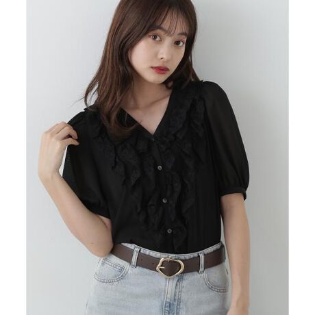 襟と前身頃にフリルをあしらったフェミニンな雰囲気のブラウス。Vネックとフリルを組み合わせ、シャープでありながら甘さを抑えたデザインです。きれいめパンツ・ハーフパンツ・デニムパンツ合わせがおすすめ。色によってフリルの素材が異なり、ホワイトと黒はレースを使用、ブルーは布帛を使用しています。
