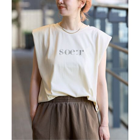 コットン天竺に太めに折り返した肩先のタックがやや短めの袖丈ながら二の腕カバーし、すっきり見えするシルエットになっています。箔のロゴプリントがアクセントになって、Tシャツのバリエーションとしておすすめの一枚です。