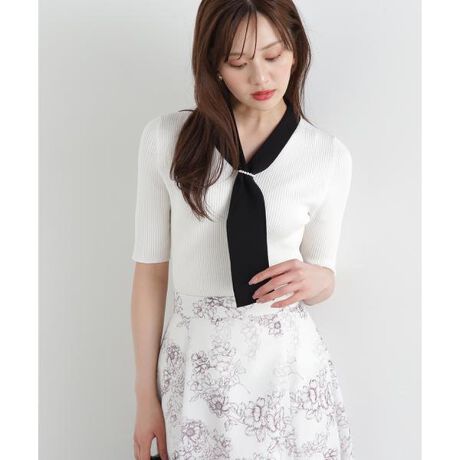 華やかなパール調リングがポイントのボウタイニットです。パール調リングは取り外しが出来、ボウタイをひと巻きしてラフに垂らすのもおすすめ。きれいめスカートやパンツ合わせできちんとスタイルにも、デニムパンツ合わせでキレイめカジュアルにも着回せます。