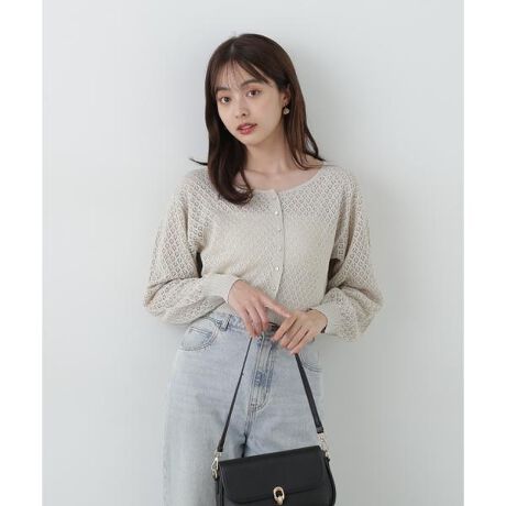透かし編みにラメ糸を使ったショート丈のカーディガンです。小さいボタンを付けて愛らしいアクセントをプラス。お持ちのインナーを合わせてトップス風に着こなせます。