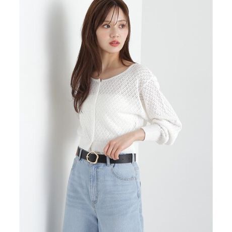 透かし編みにラメ糸を使ったショート丈のカーディガンです。小さいボタンを付けて愛らしいアクセントをプラス。お持ちのインナーを合わせてトップス風に着こなせます。