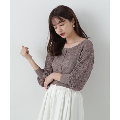 透かし編みにラメ糸を使ったショート丈のカーディガンです。小さいボタンを付けて愛らしいアクセントをプラス。お持ちのインナーを合わせてトップス風に着こなせます。