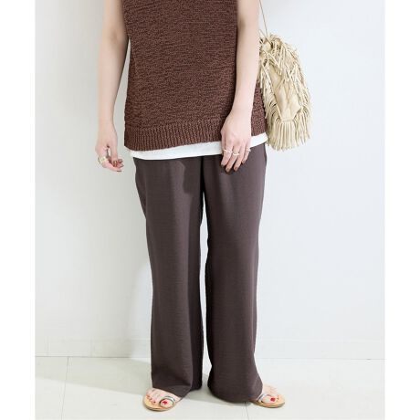 さらっと落ち感のある素材感で、ウエストゴムでリラックスした履き心地ながらも、微フレアのシルエットできれい見えします。タック入りなのできれいめなトップスと合わせて、お出掛けスタイルにもおすすめのアイテムです。