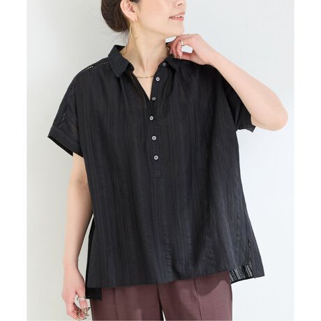 ドビー織のシャドーストライプの程よくシアー感とヘルシーさのあるブラウスです。 衿を小さめにしドルマンスリーブのゆったりとした袖が特徴で、着丈に前後差をつけているので、ワイド系のボトムス合わせも相性が良くおすすめです。