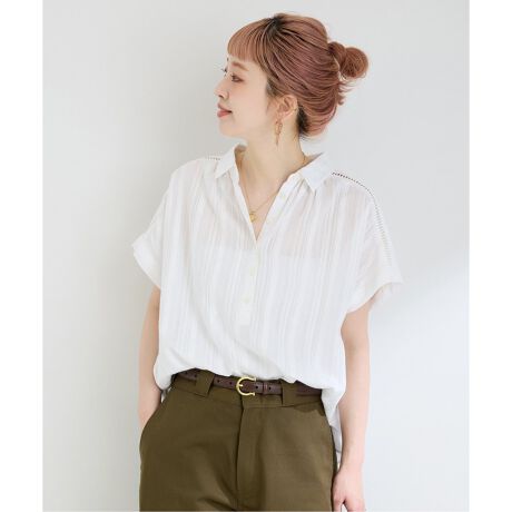 ドビー織のシャドーストライプの程よくシアー感とヘルシーさのあるブラウスです。 衿を小さめにしドルマンスリーブのゆったりとした袖が特徴で、着丈に前後差をつけているので、ワイド系のボトムス合わせも相性が良くおすすめです。