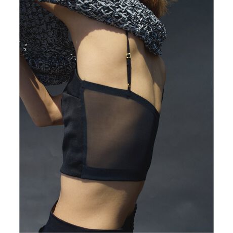 上品な光沢のサテン素材とバックのメッシュ地のコンビ使いがモードな雰囲気を醸す一枚。