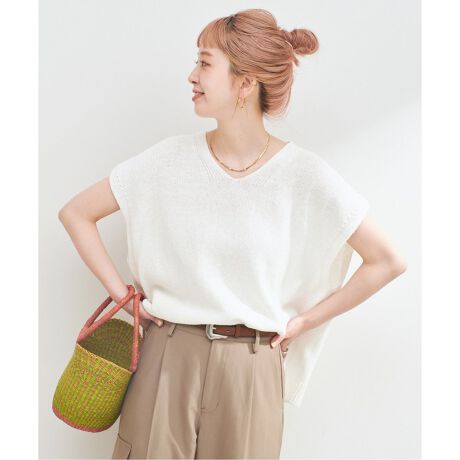太番手のリネンコットンを甘撚りした柔らかい風合いが魅力のサマーニット。ゆったりしたシルエットと浅めのVネック開きで一枚着でも着やすく、脇にスリットと前後差のある着丈にすることで抜け感の出るデザインになっています。