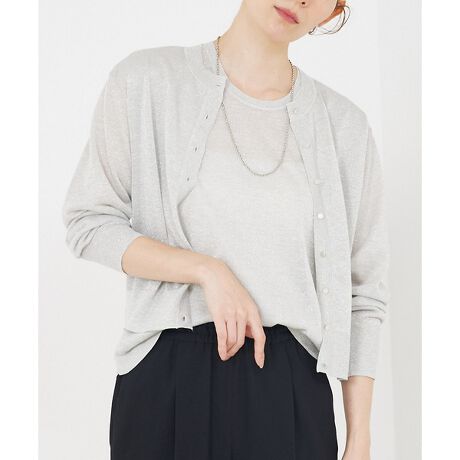 [型番:32500041002]*Detail*ラメ糸を織り込んだハイゲージニットカーディガン。前丈を短く設計し、ボトムとのバランスが取りやすいシルエットに。小さなメタル釦が、さりげないアクセントに。*Coordinate*ワイドパンツと合わせれば、すっきりとしたIラインが完成。インナーにはシンプルなタンクトップやTシャツを合わせて、素材感を引き立てて。足元はフラットシューズで抜け感をプラスして、会的なリラックススタイルに。