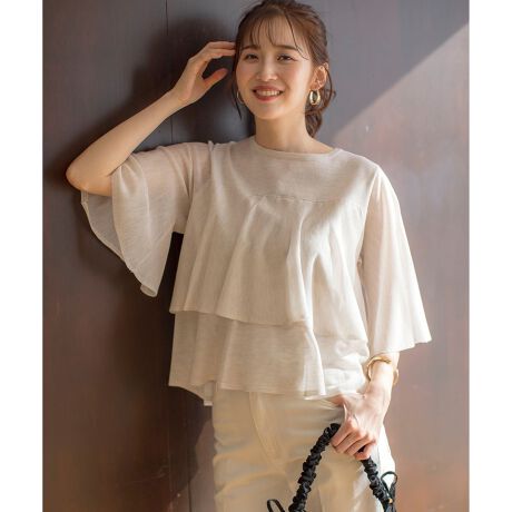 ・繊細な素材感を活かした軽くフェアリーなニット・ほどよいシアーな透け感でフェミニンな印象に・フリルをティアード状にしたデザインで女性らしさ満点・お腹周りや二の腕もカバーできるデザイン