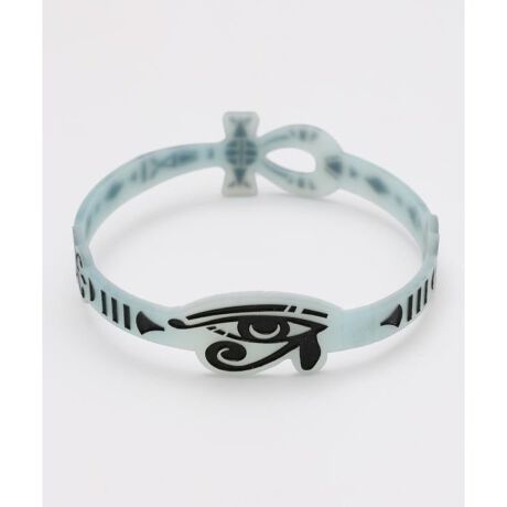 紫外線を浴びると色が変わるラバーアンクレット。古代エジプトの・ヒエログリフの魔除けをモチーフにしたアイテム。【アンク】は生命の鍵・不滅の生命力を。【ラーの目】は全てを見通す太陽神ラーの右目を表しています。※1本でのお届けとなります※