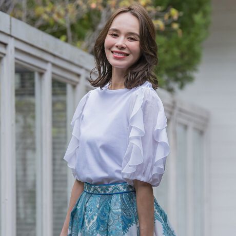 華やかなラッフルスリーブが印象的なデザイントップス。