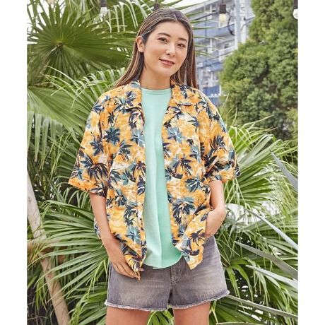 パイナップルやパームツリーなどのハワイアン柄がプリントされたアロハシャツ。薄手で軽やかなレーヨン生地で、暖かい季節に活躍します。シャツを収納できるサイズ感の巾着バッグつきで、持ち運びに最適です。
