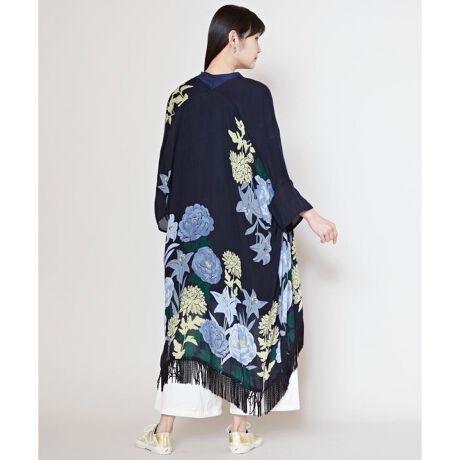 [型番:7IA-5201-2025]軽く手触りの良いレーヨン素材のUVカット羽織。清涼感があり、日差しよけや、夏の冷房対策にピッタリの一枚です。裾にあしらったフリンジが女性らしさをより演出してくれます。UVカット